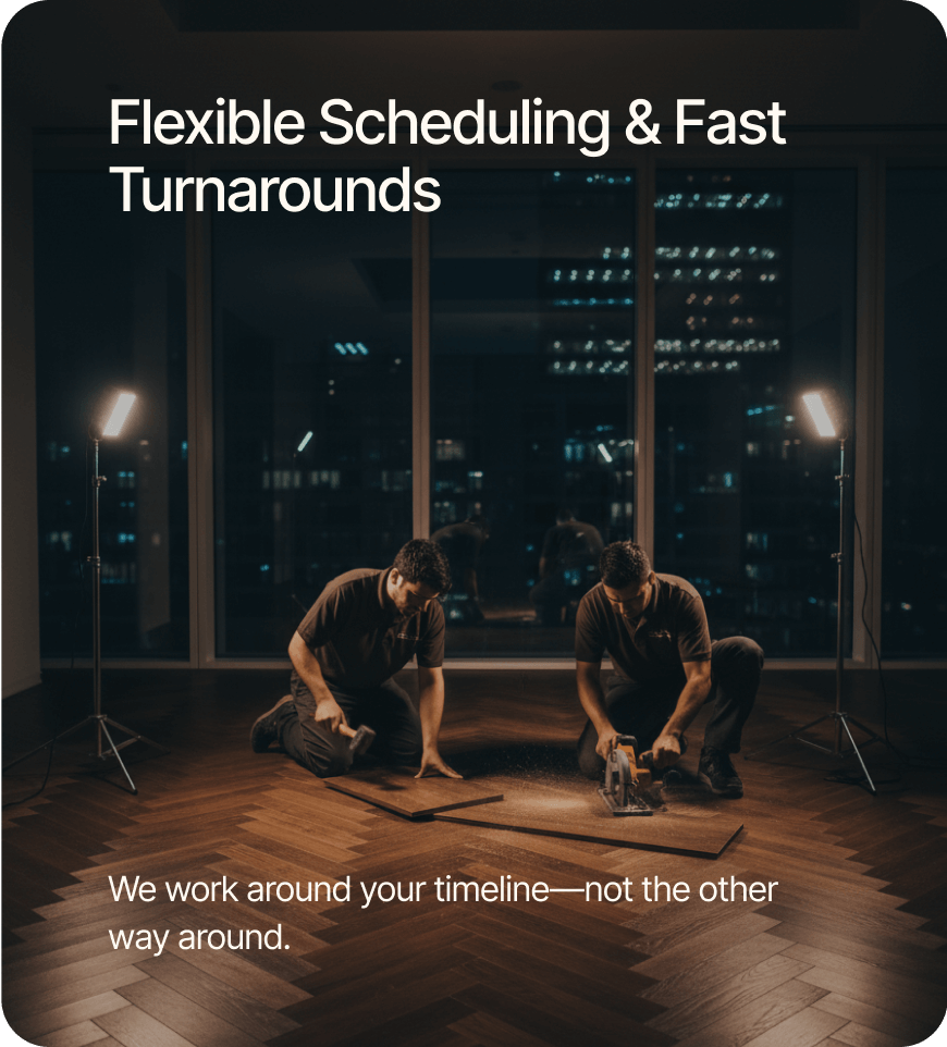 The project duration depends on several factors, including the size of the area, the type of flooring selected, and the condition of the subfloor. We provide a clear and realistic timeline with every project proposal.